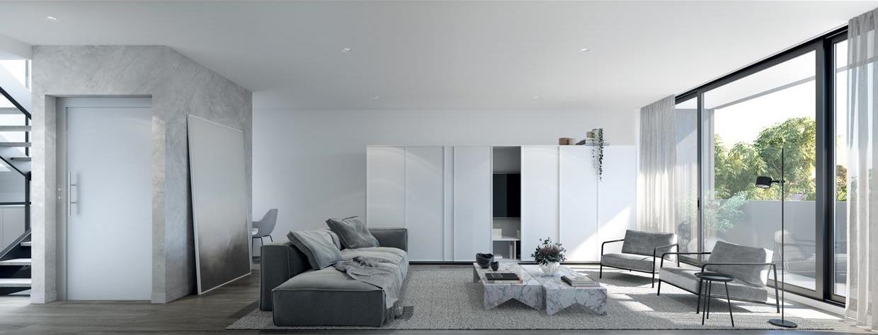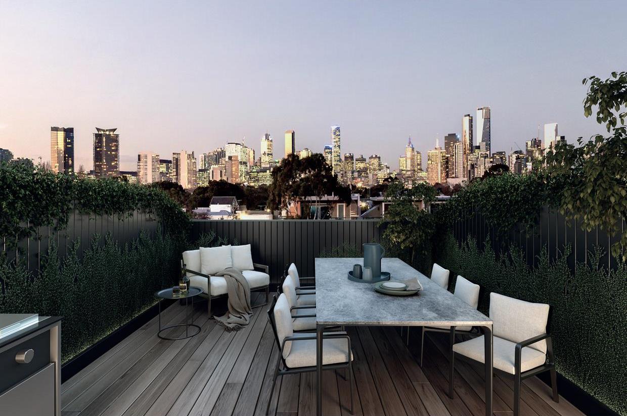 On the corner of Graham and Princes Street Port Melbourne is a small development of 8 luxury three storey townhouses. The facade is a composition of white portals with contrasting dark metal panel spandrels. The three stories are connected by a feature stair and lift leading up to a rooftop terrace with panoramic views of the Melbourne skyline to the north.