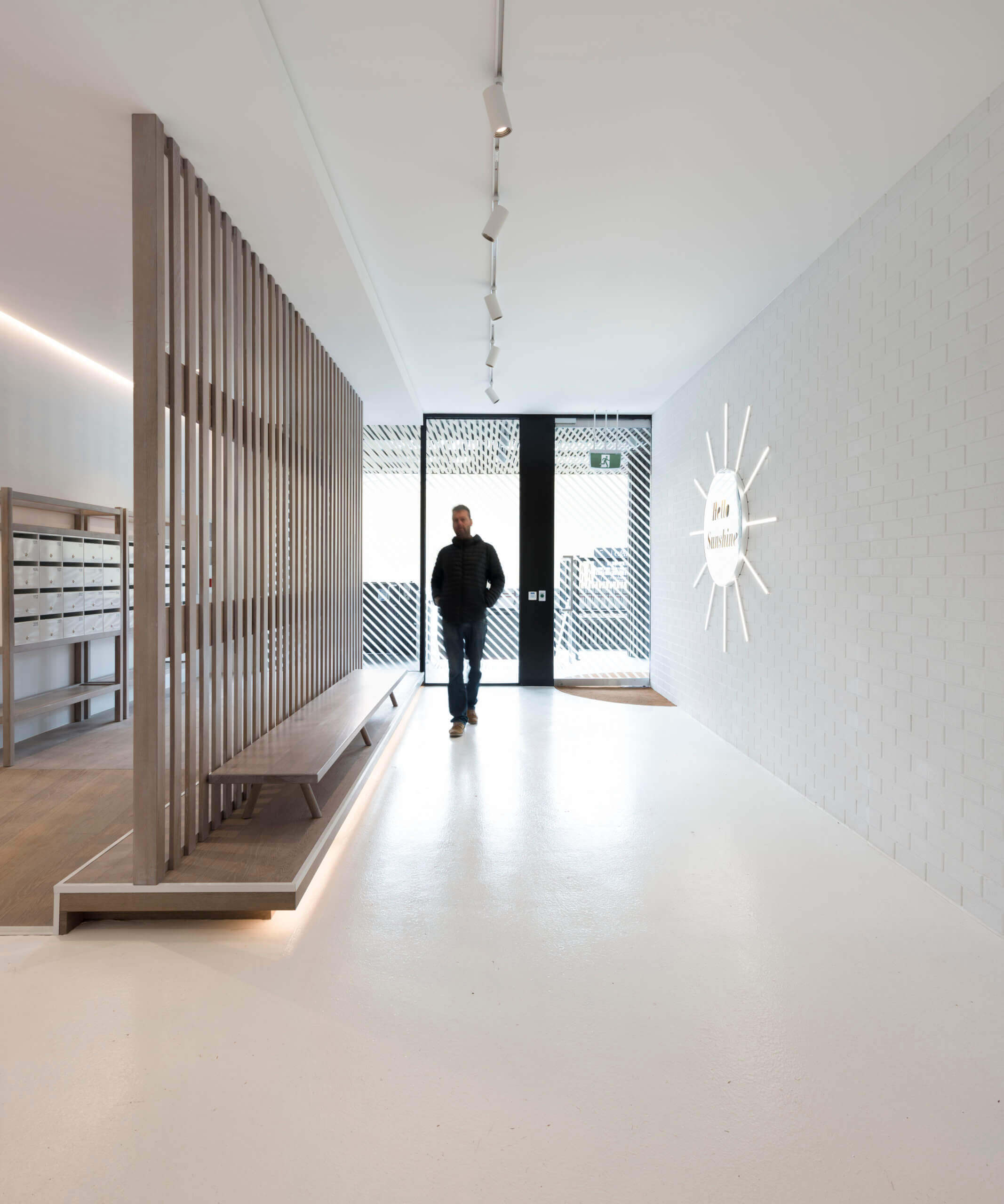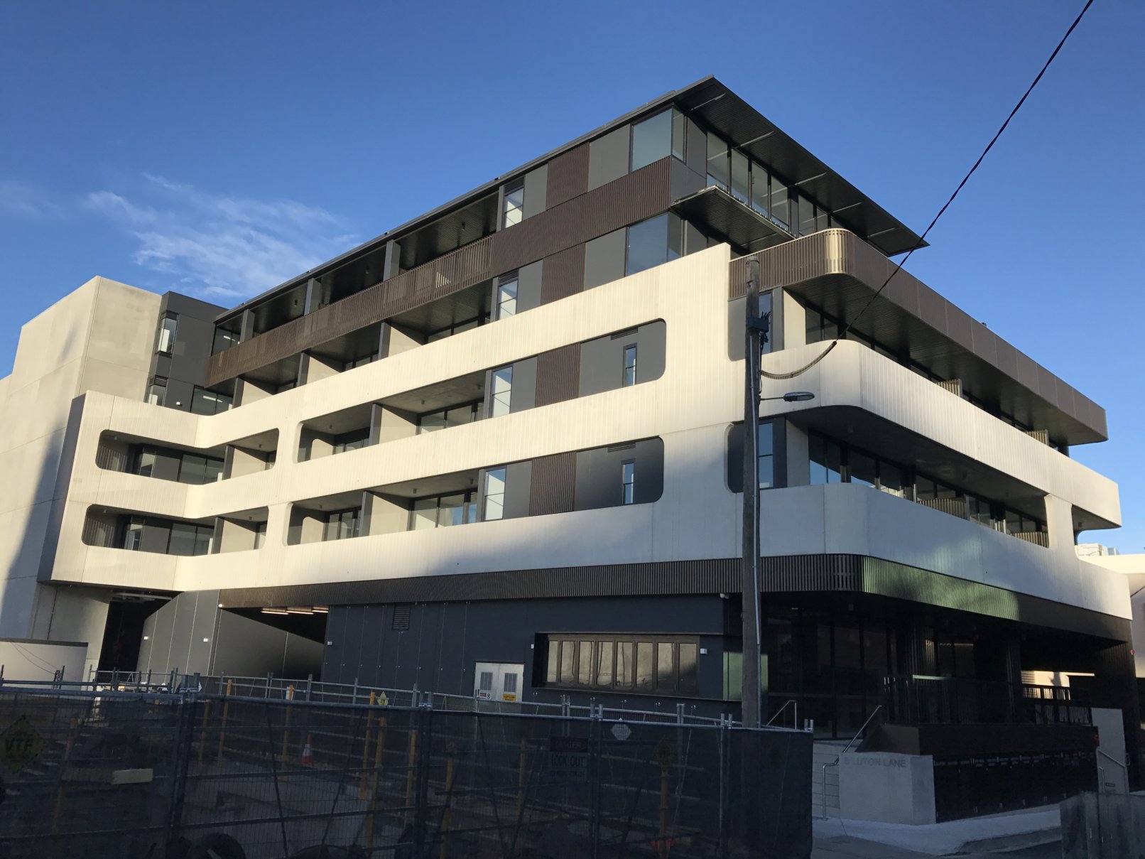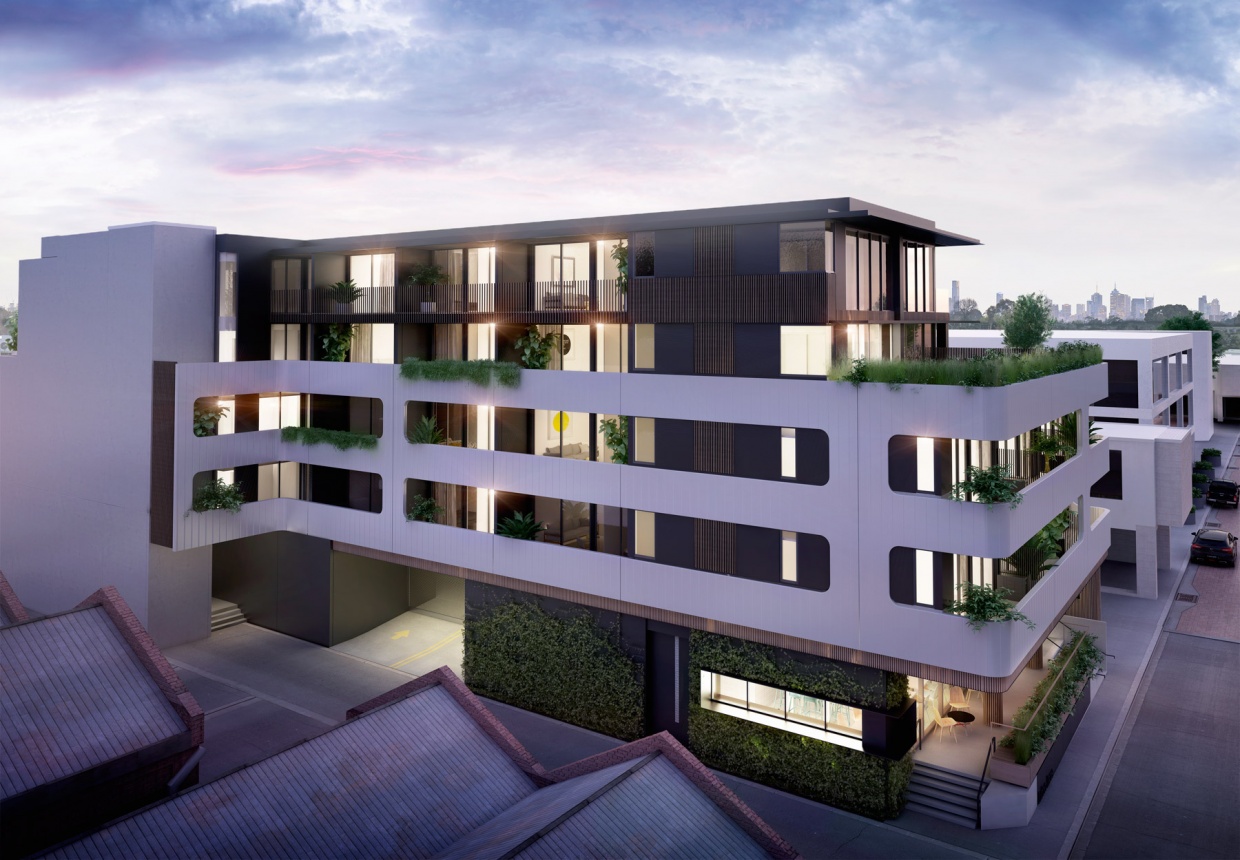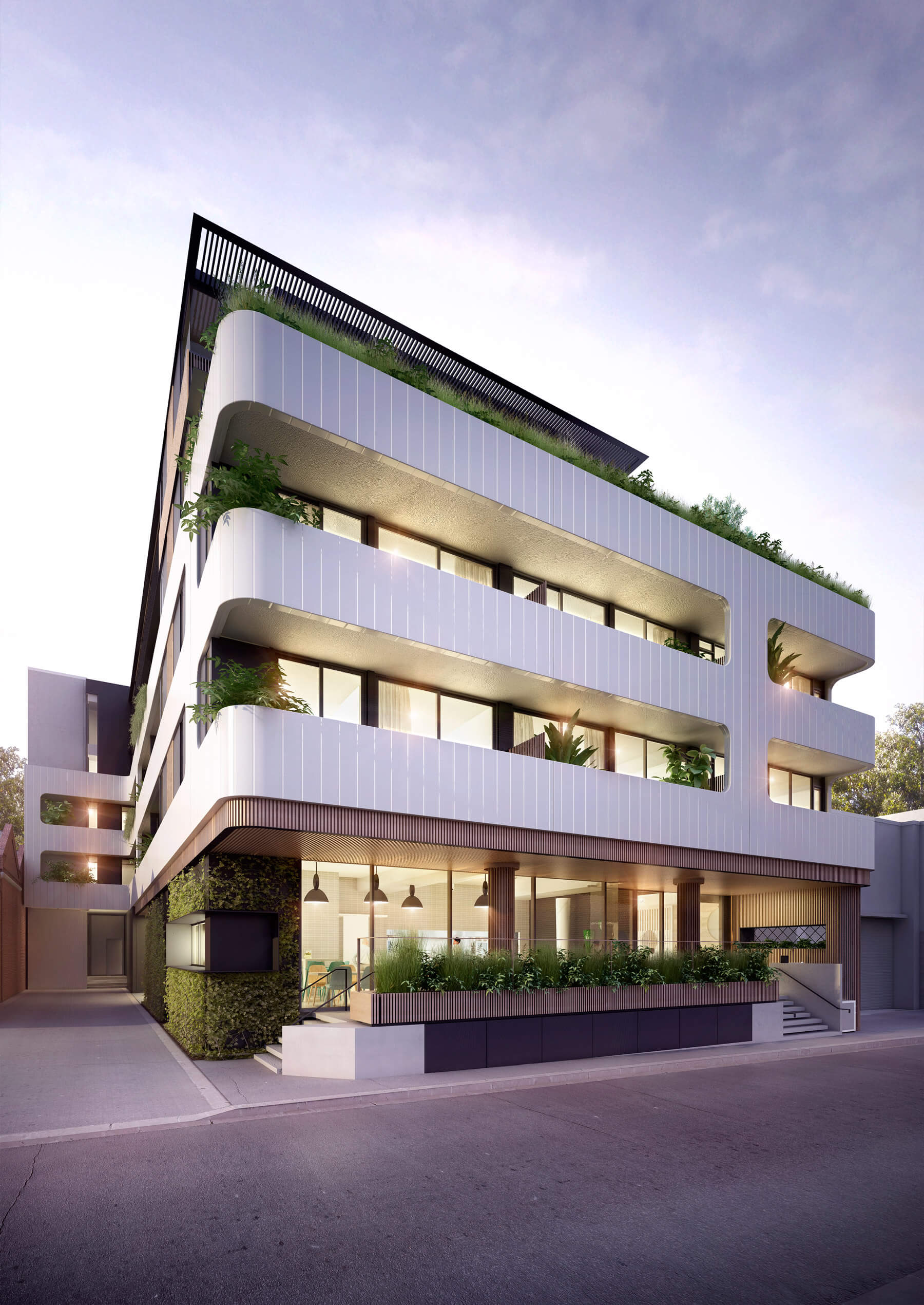 Luton lane is a composition of three materials, white off form precast profiled concrete wrapping around the base levels, intricate timber battening weaving from the entry to the roof, and lush green landscaping tying the elements together. The fineness of detail and freshness of the material palette set it apart from its context and create a welcoming residential address.