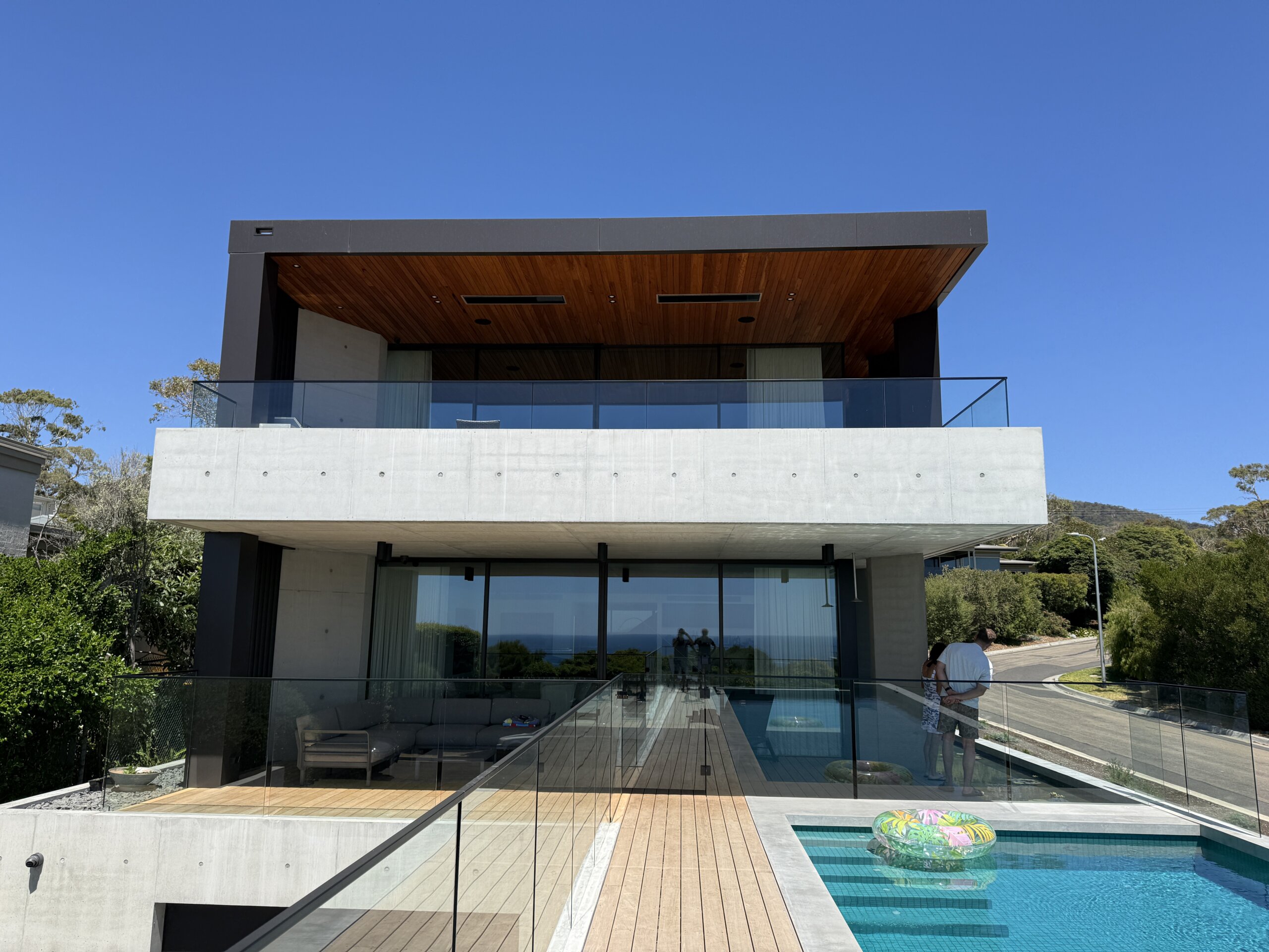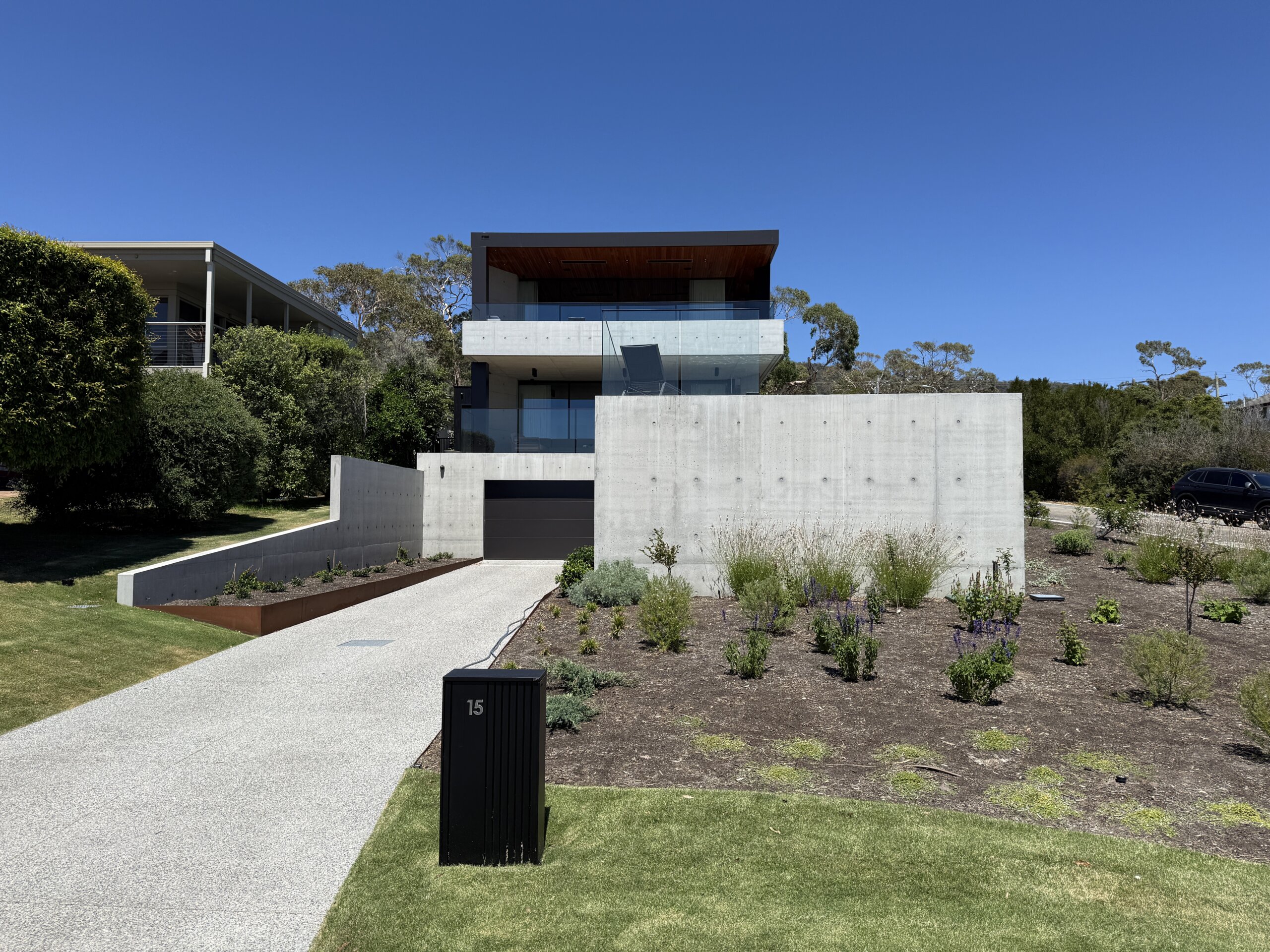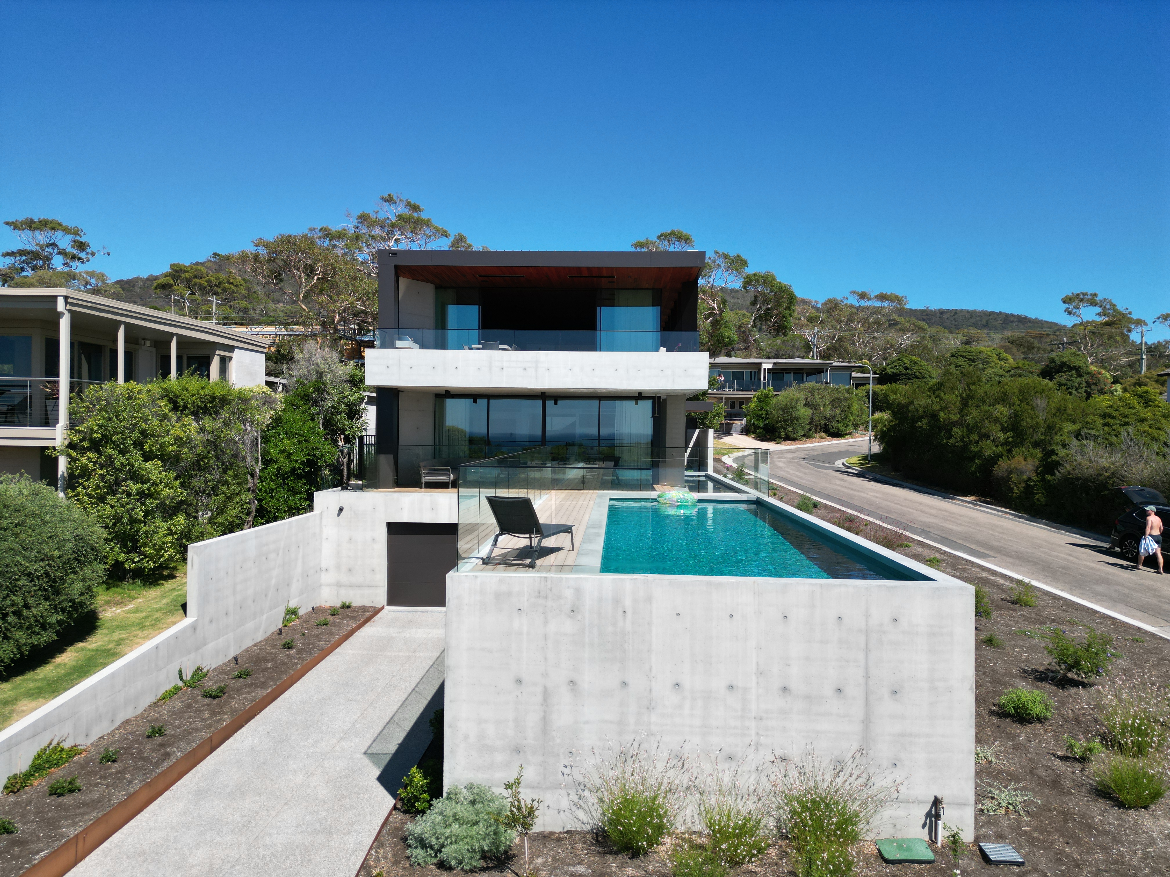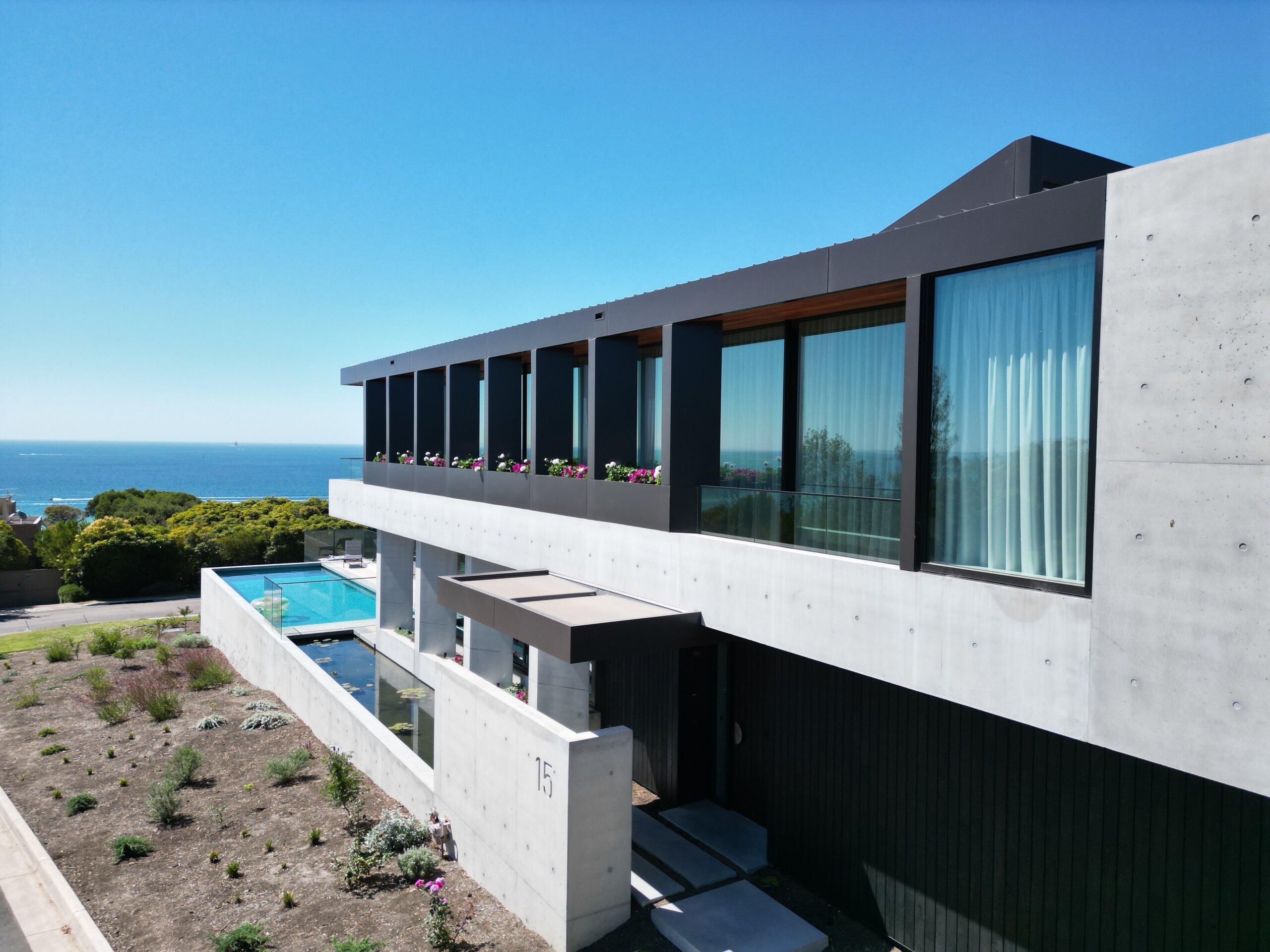 Sitting on a corner, high on the hill in McCrae, the house has commanding views over Port Philip Bay. The design sought to capitalise on the view while providing privacy from the road. An off form concrete base steps down the slope and wraps around the pool and pond. Angled concrete blade walls screen the ground floor living room and dark bronze steel blades screen the first floor lounge while opening up to the panoramic view.
