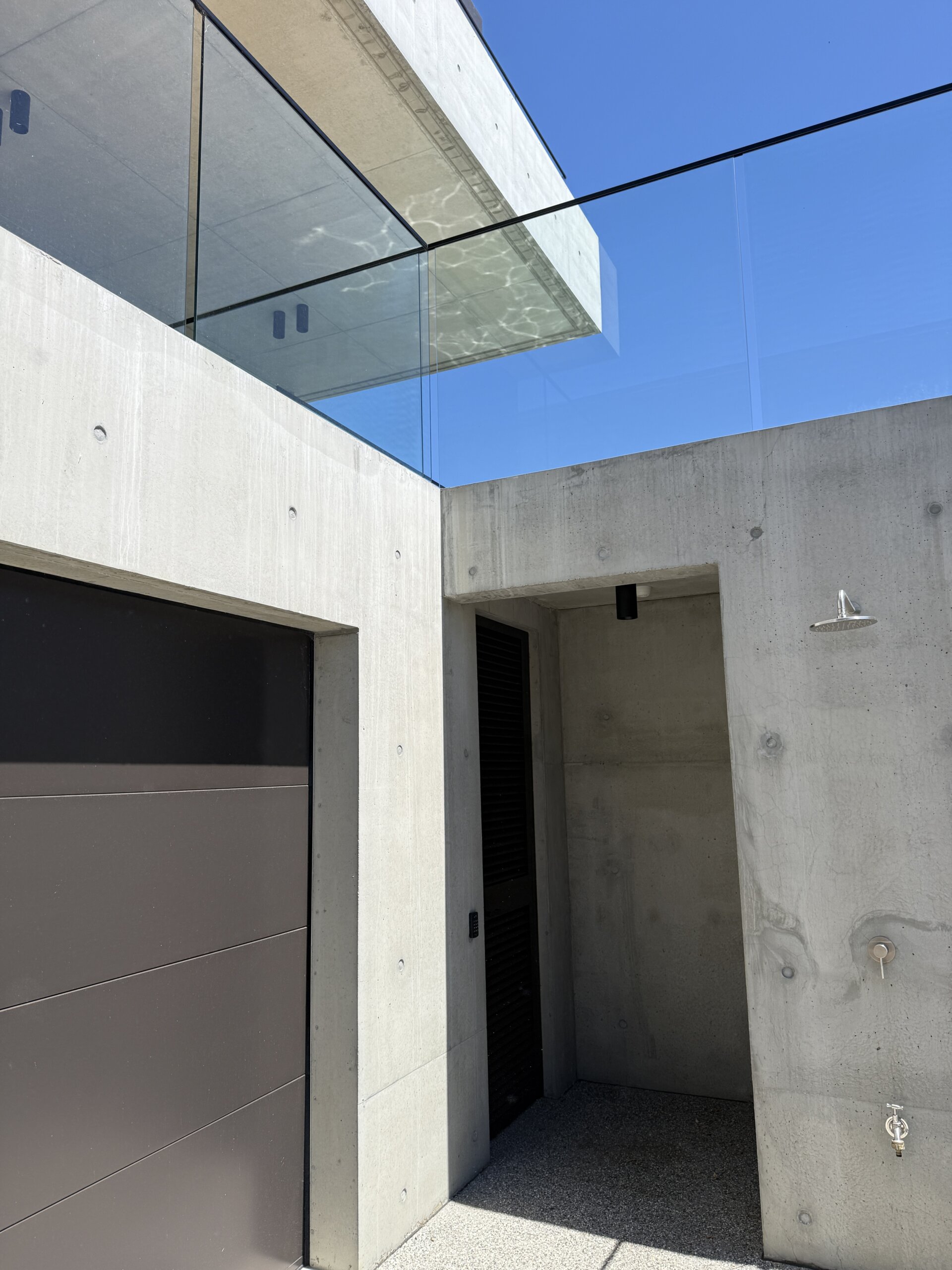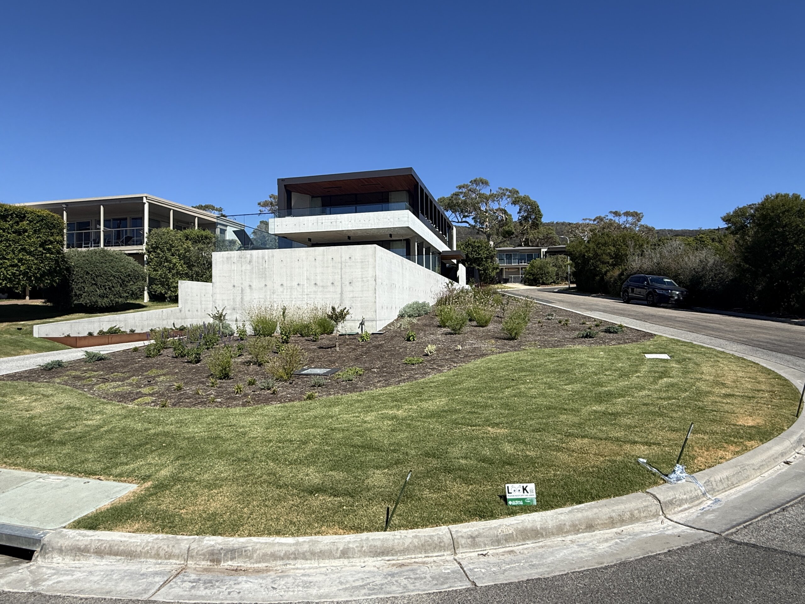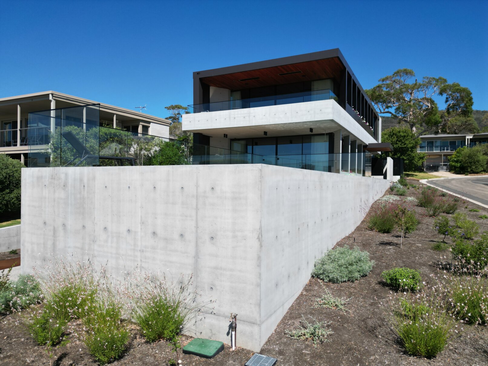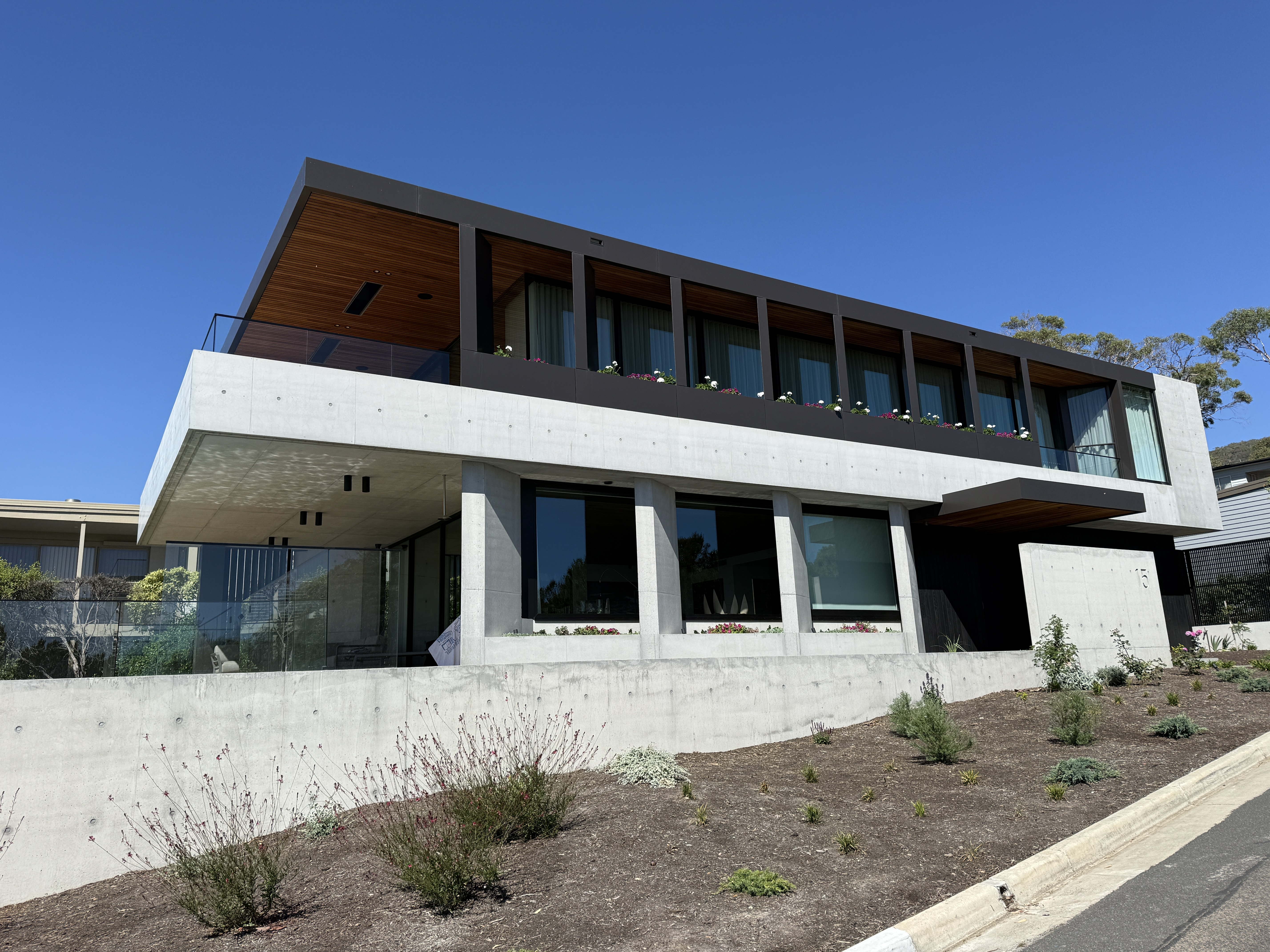 Sitting on a corner, high on the hill in McCrae, the house has commanding views over Port Philip Bay. The design sought to capitalise on the view while providing privacy from the road. An off form concrete base steps down the slope and wraps around the pool and pond. Angled concrete blade walls screen the ground floor living room and dark bronze steel blades screen the first floor lounge while opening up to the panoramic view.