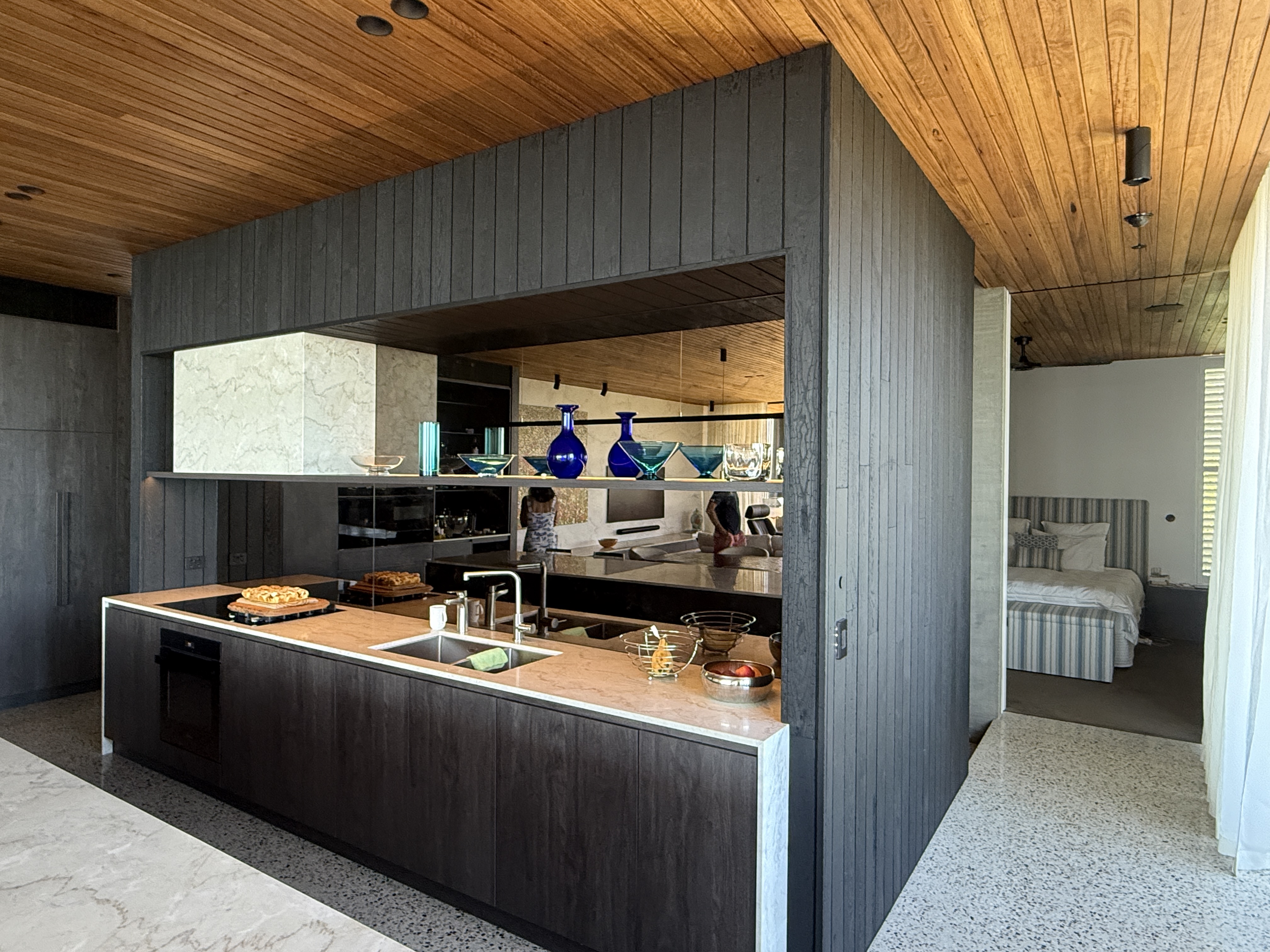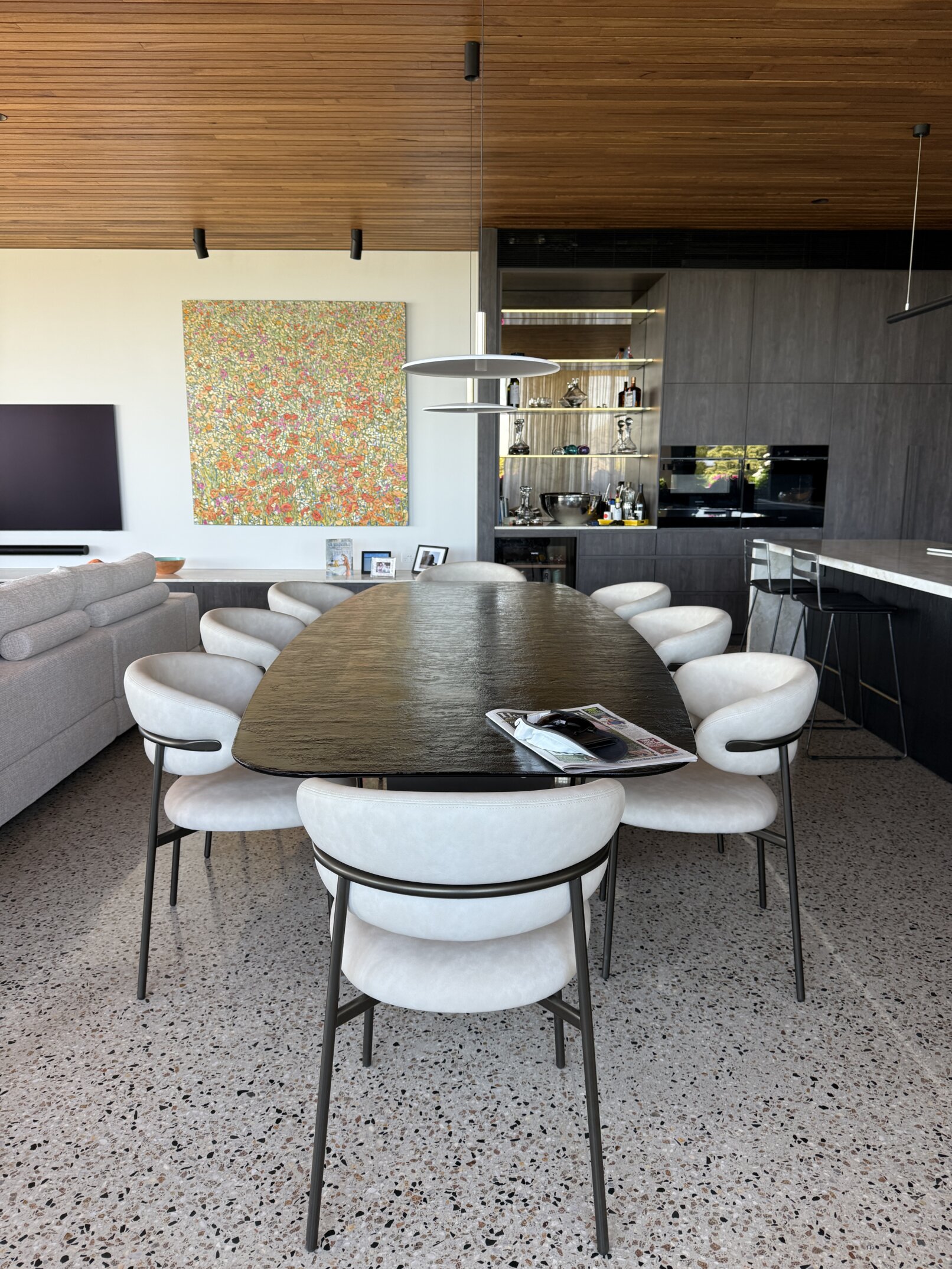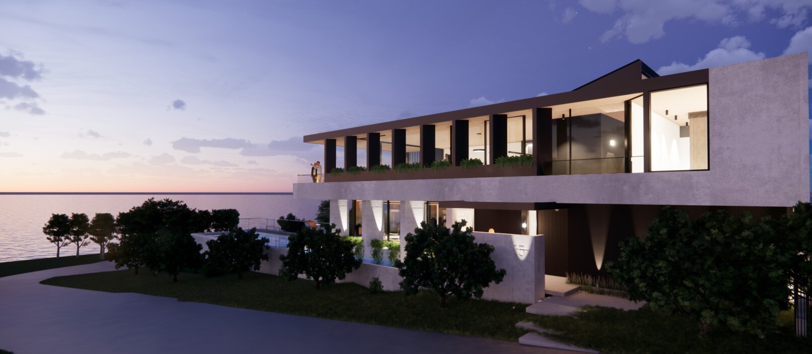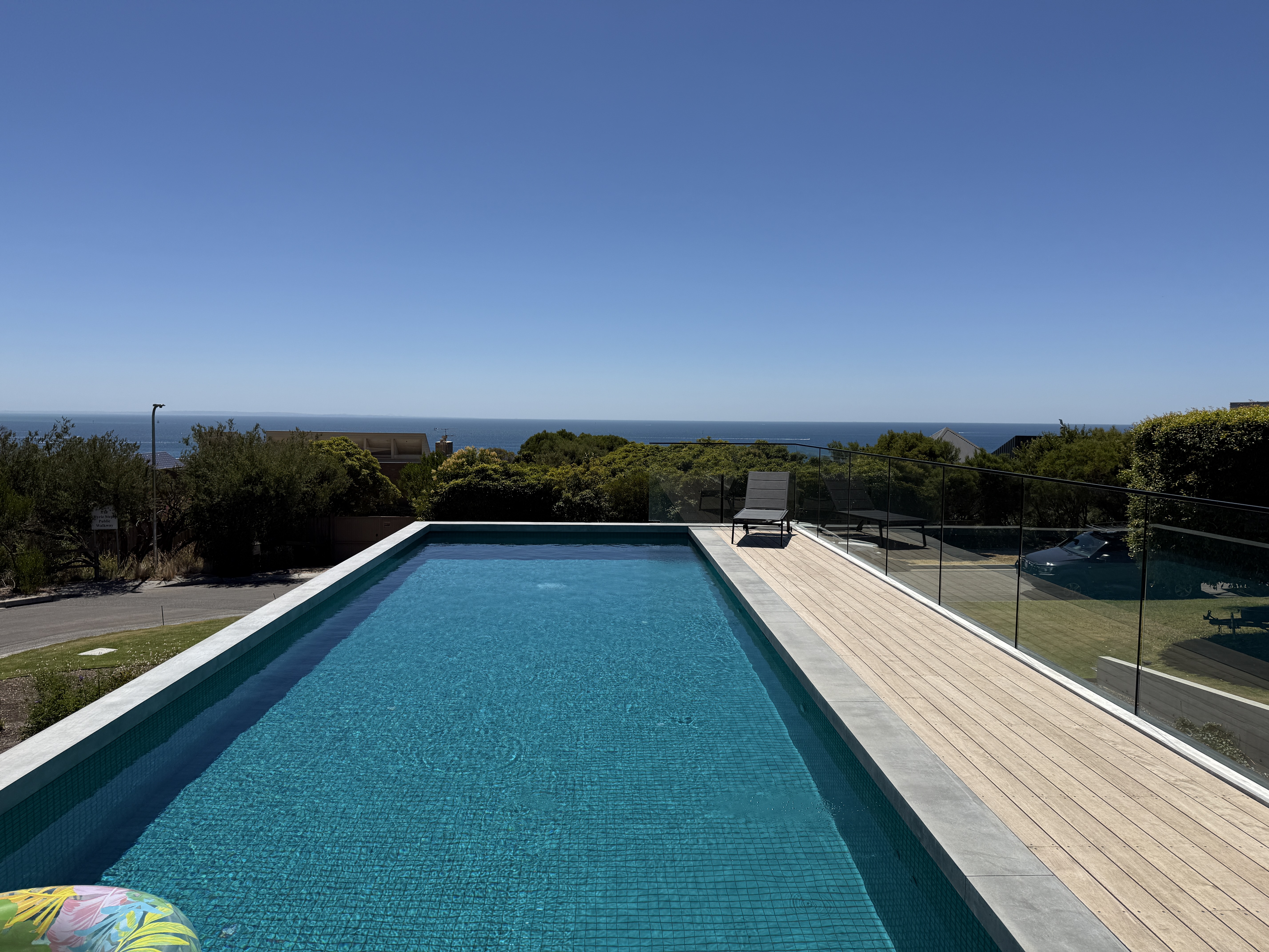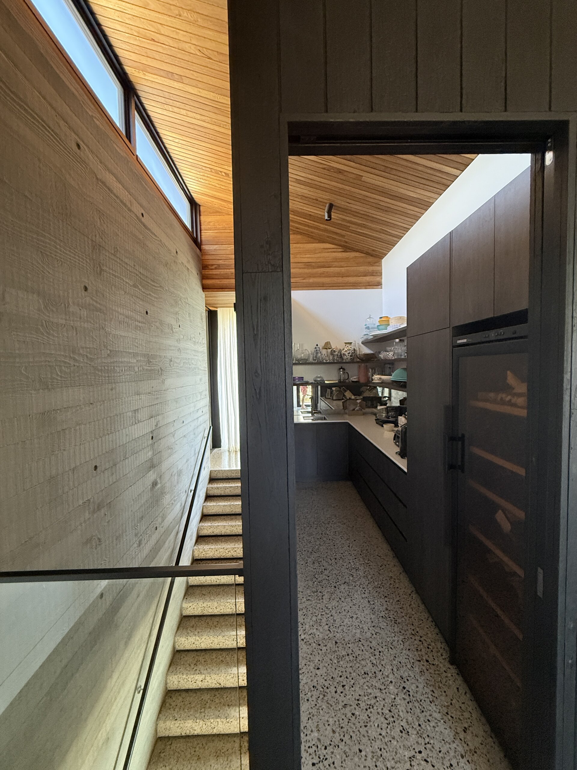 Sitting on a corner, high on the hill in McCrae, the house has commanding views over Port Philip Bay. The design sought to capitalise on the view while providing privacy from the road. An off form concrete base steps down the slope and wraps around the pool and pond. Angled concrete blade walls screen the ground floor living room and dark bronze steel blades screen the first floor lounge while opening up to the panoramic view.