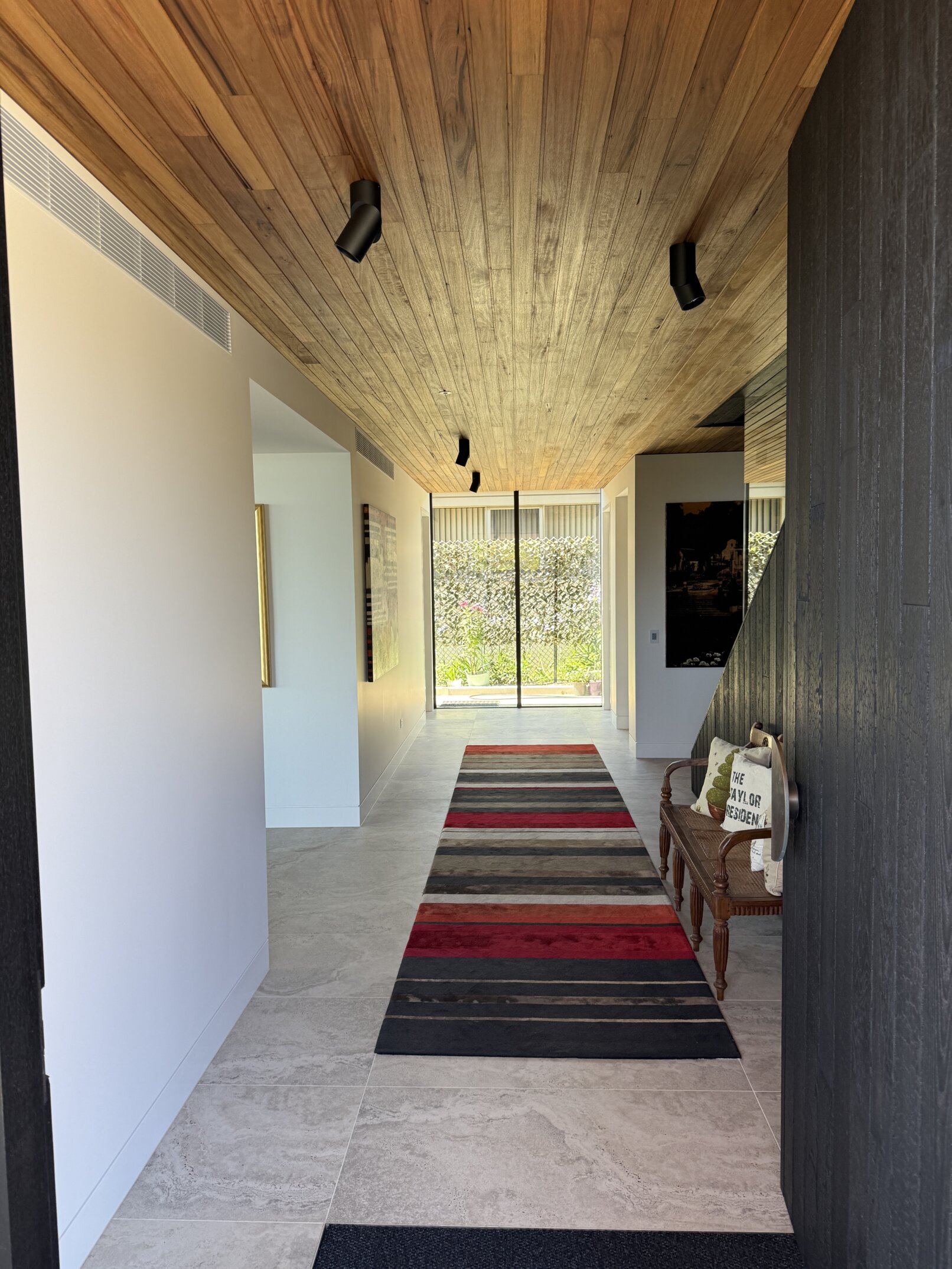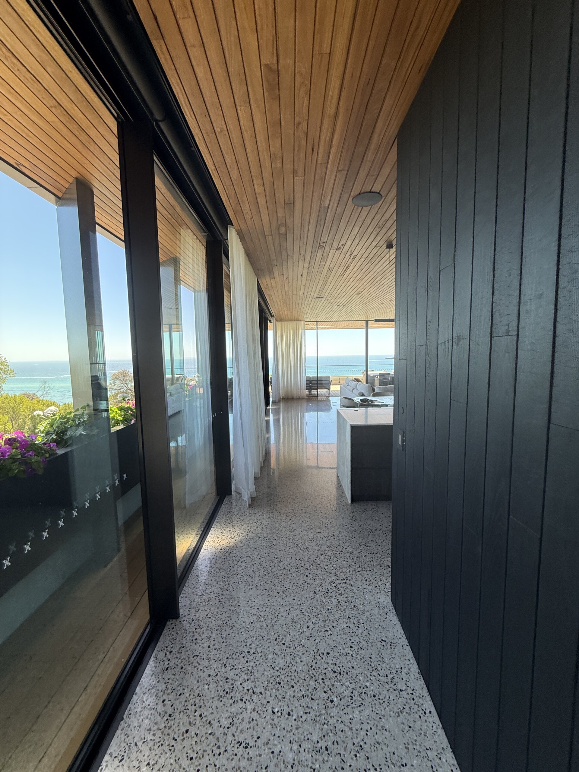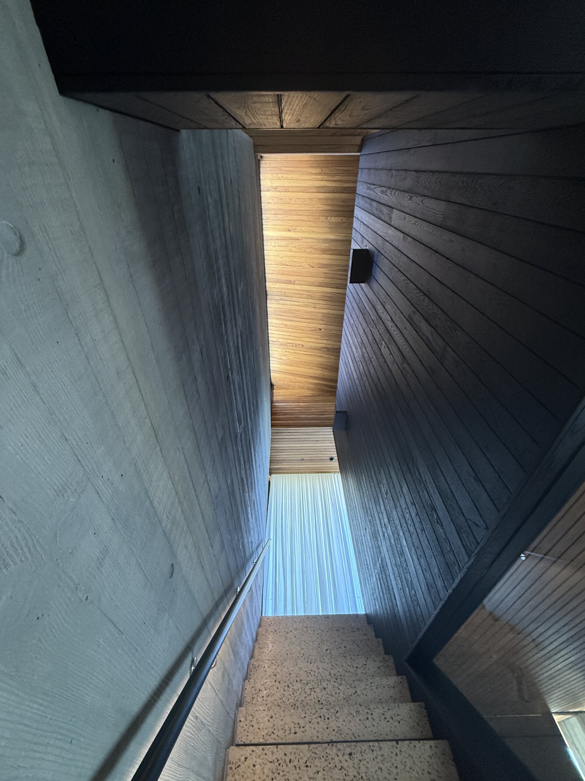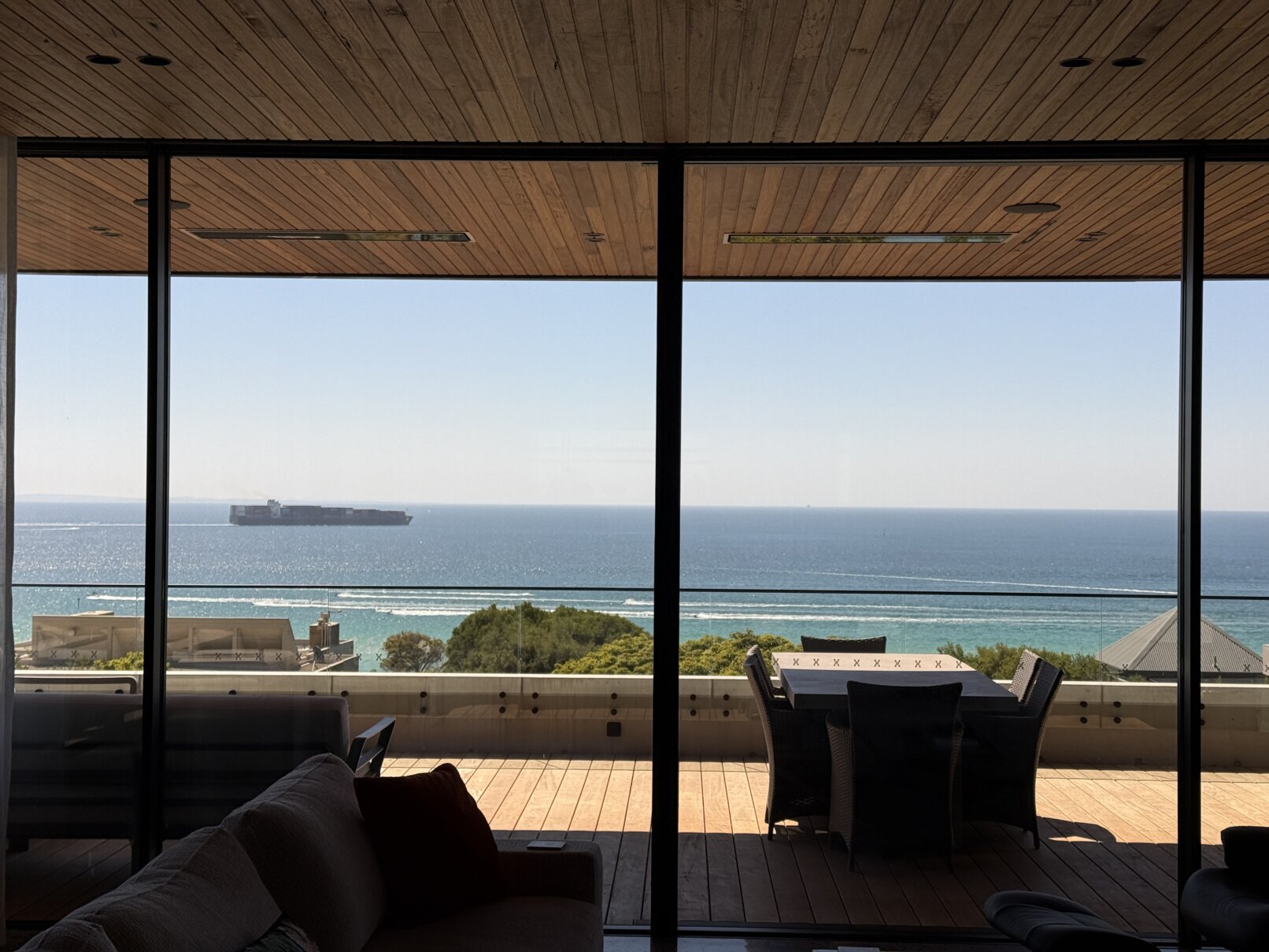 Sitting on a corner, high on the hill in McCrae, the house has commanding views over Port Philip Bay. The design sought to capitalise on the view while providing privacy from the road. An off form concrete base steps down the slope and wraps around the pool and pond. Angled concrete blade walls screen the ground floor living room and dark bronze steel blades screen the first floor lounge while opening up to the panoramic view.